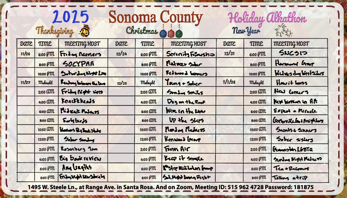 « All Events This event has passed. SCIF 2025 Thanksgiving Alkathon November 26, 2025 @ 6:00 pm - November 27, 2025 @ 8:00 pm « Halloween Movie & Meeting SOCYPAA Gifts Of Sobriety » 6:00PM 11/26 – 8:00PM 11/27 1495 W Steele Ln, Santa Rosa, CA 95403 ZOOM ID: 515-962-4728 // PW: 181875 Add to calendar Google Calendar iCalendar Outlook 365 Outlook Live Details Start: November 26, 2025 @ 6:00 pm End: November 27, 2025 @ 8:00 pm Organizer SCIF Venue 1495 W Steele Ln 1495 W Steele Ln. Santa Rosa, 95403 United States + Google Map