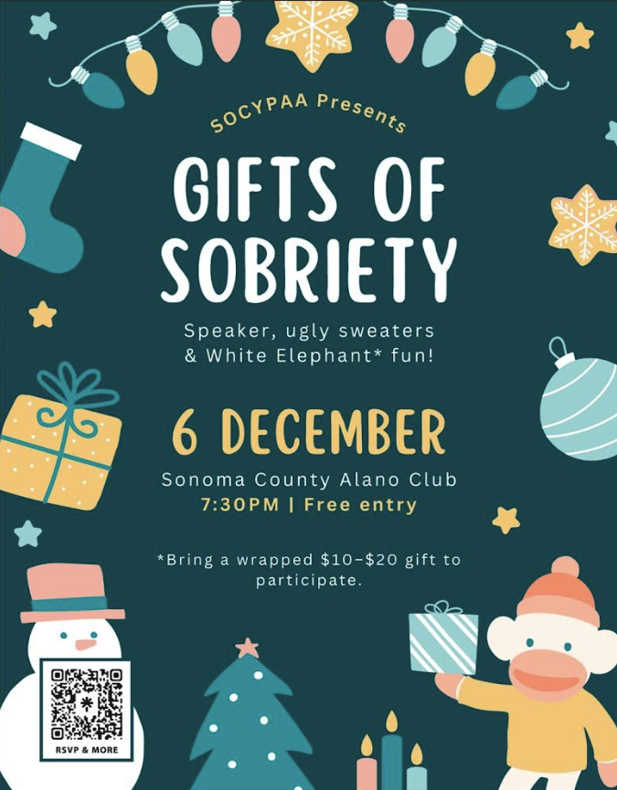 « All Events SOCYPAA Gifts Of Sobriety December 6 @ 7:30 pm - 9:00 pm « SCIF 2025 Thanksgiving Alkathon SCIF New Year’s Dance » Add to calendar Google Calendar iCalendar Outlook 365 Outlook Live Details Date: December 6 Time: 7:30 pm - 9:00 pm Venue Alano Club 1050 Petaluma Blvd N Petaluma, 94952 United States + Google Map