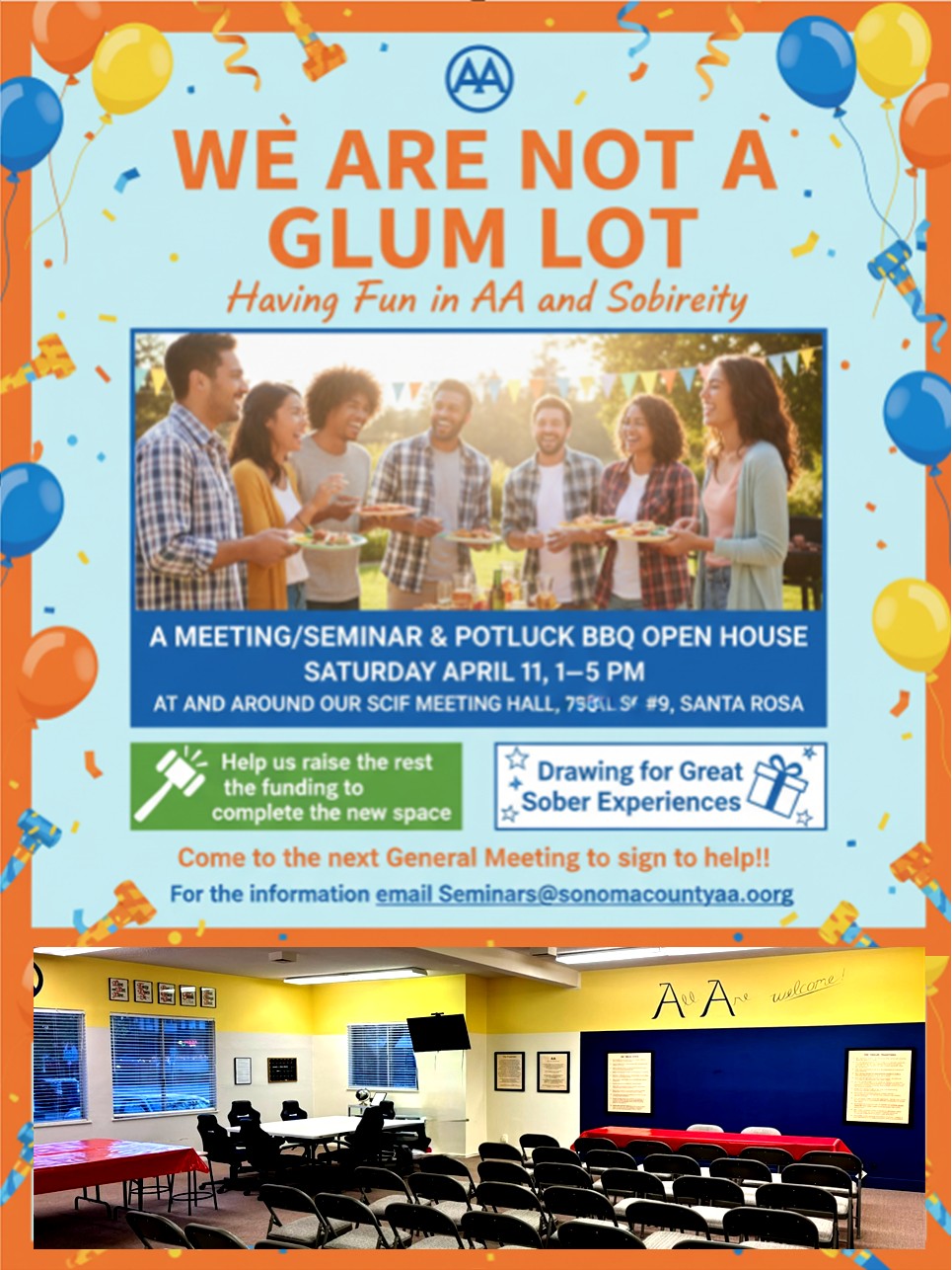 SCIF Meeting Hall 750 Mendocino Avenue, Suite 9, Santa Rosa, CA, United StatesWe Are Not a Glum Lot Having Fun in AA and Sobriety Event Details What: Meeting/Seminar & Potluck BBQ Open House When: Saturday, April 11 Time: 1:00 PM – 5:00