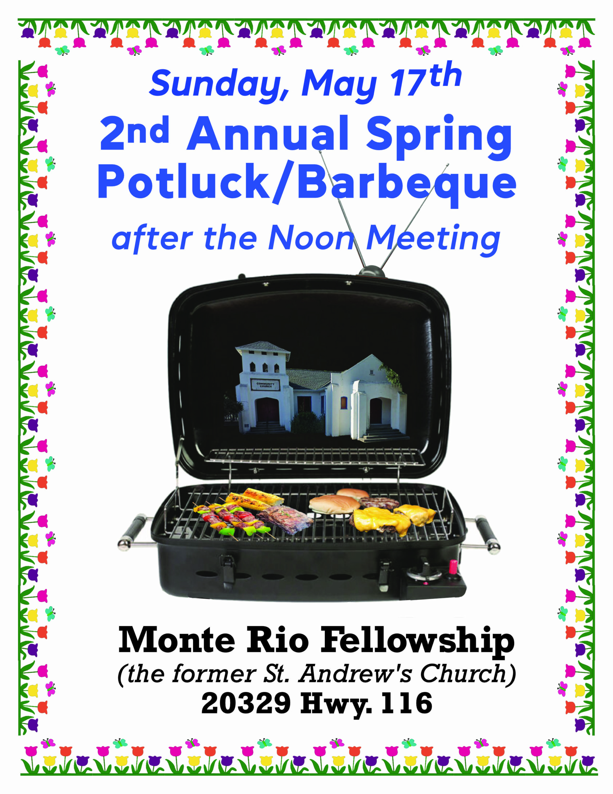 Monte Rio Fellowship 20329 Hwy 116, Monte Rio, CA, United States2nd Annual Spring Potluck / Barbecue After the Noon Meeting Date: Sunday, May 17 Join us for an afternoon of fellowship, food, and fun at our annual spring gathering! Location